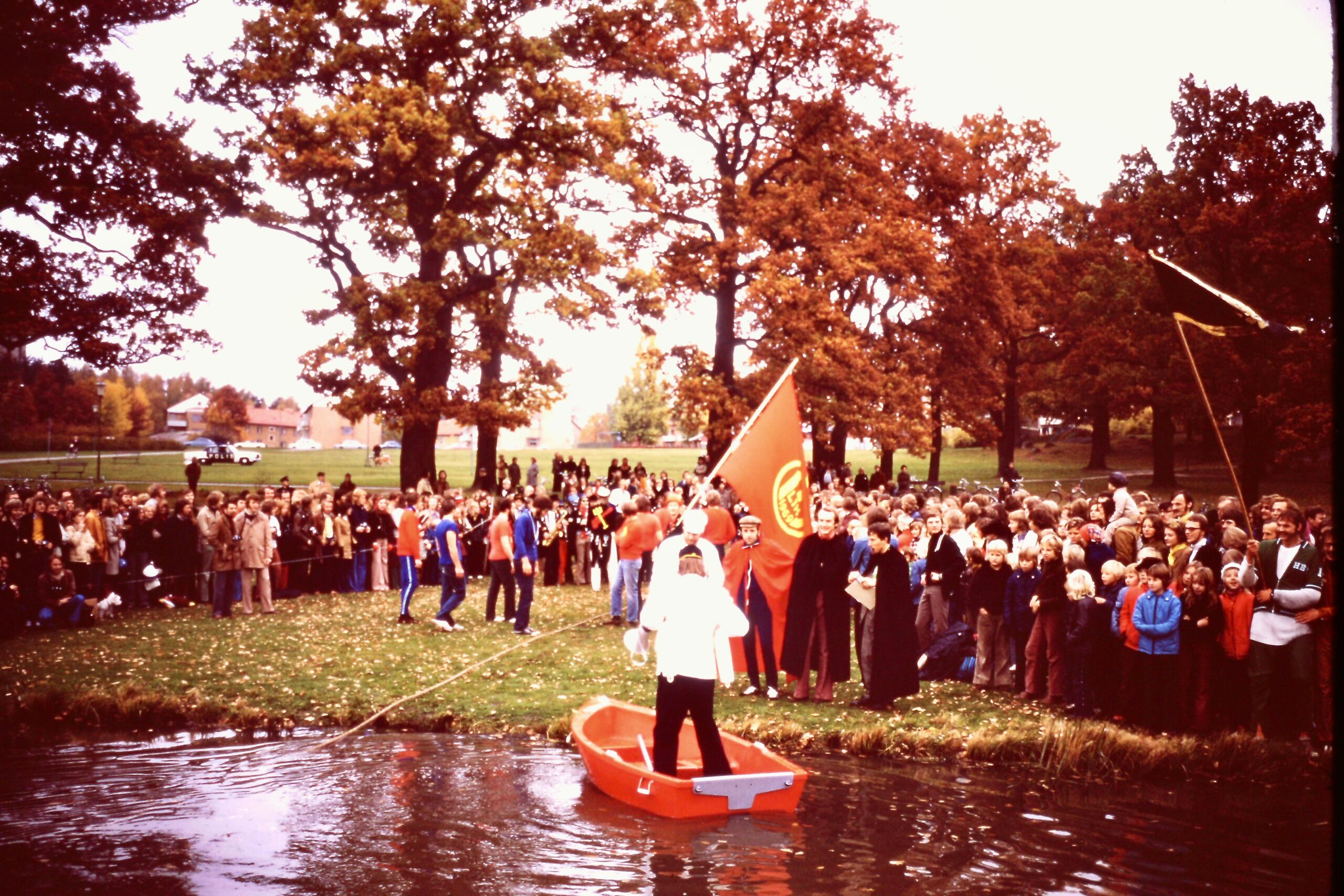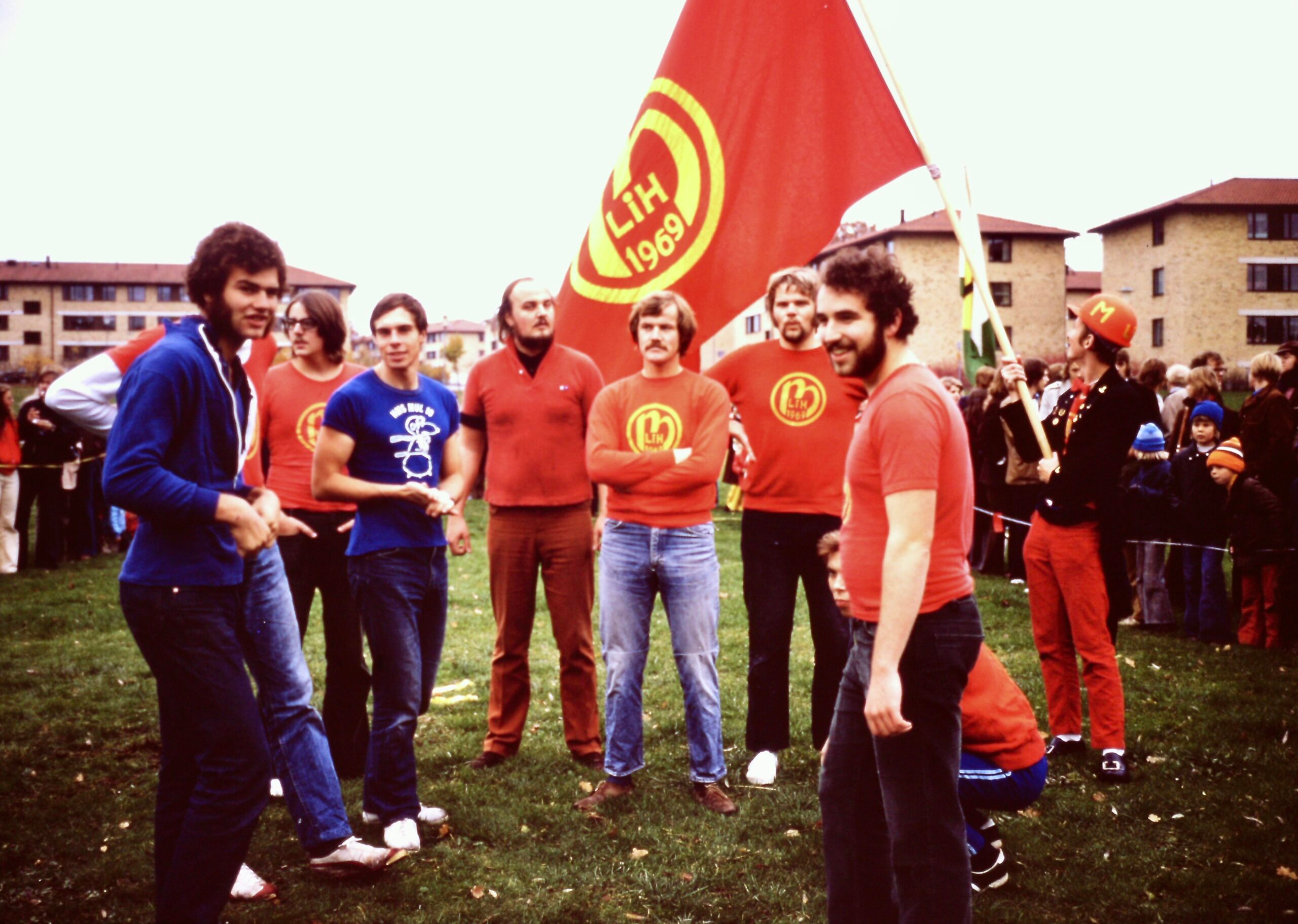 Det förekom också återkommande fester eller sittningar. Ibland var teknologer från andra linjer inbjudna, alltså från I-linjen och Y-linjen. Kommer inte ihåg eller känner alla. Men till vänster finner jag Mats Lenner i glasögon och hitom Lennart Fälldin och närmast okänd? Till Höger som gäst från Y-linjen, Pelle Wichman i vit t-shirt och hitom honom Carl-Henric Möller, därefter okänd och närmast Lennart Kloow.