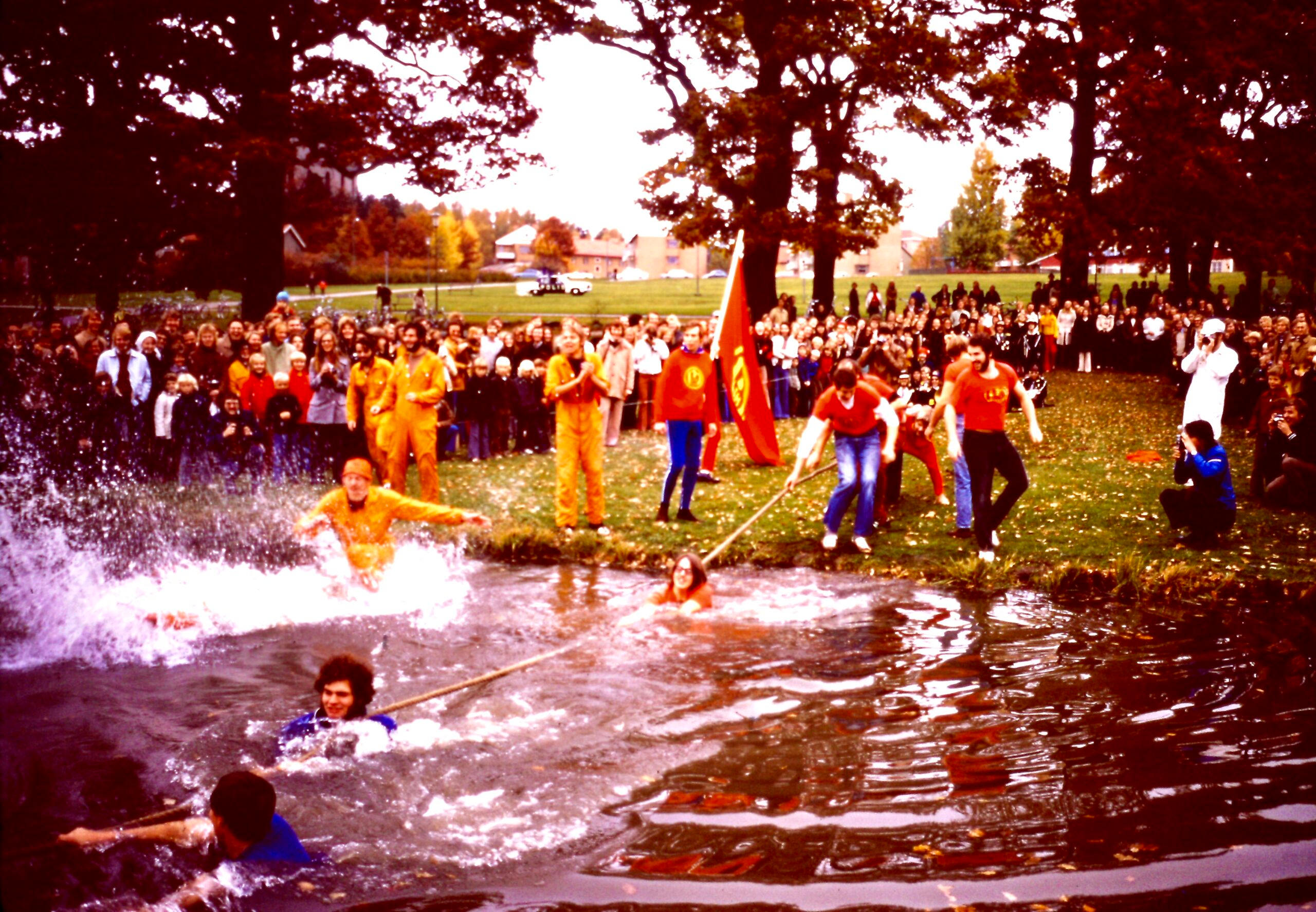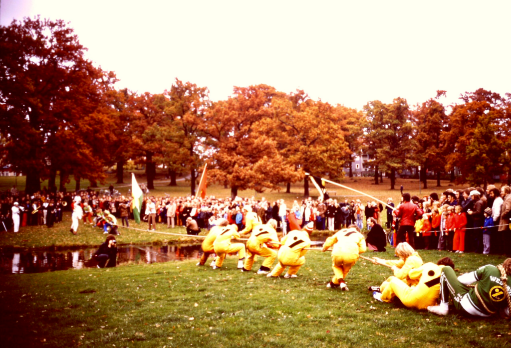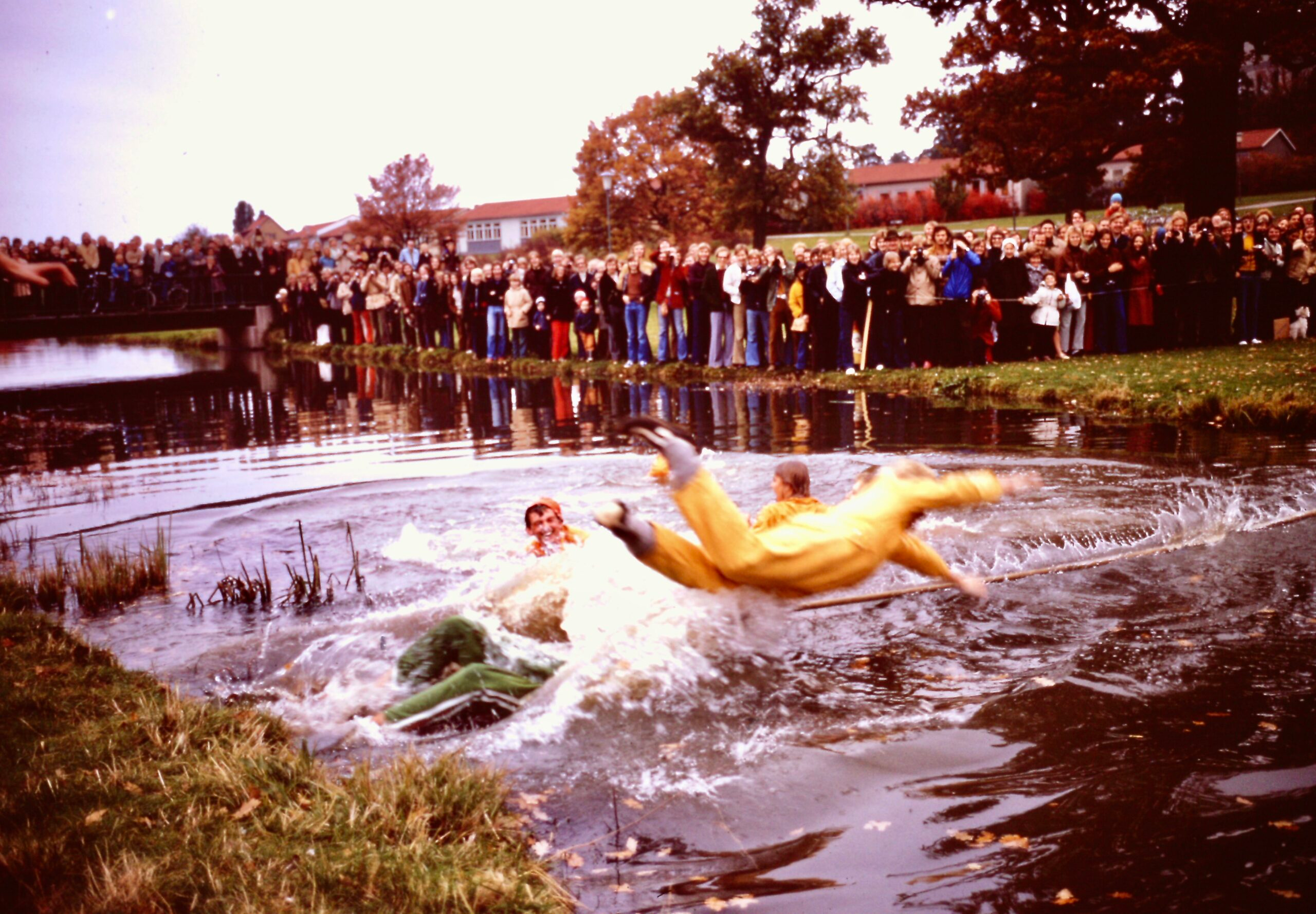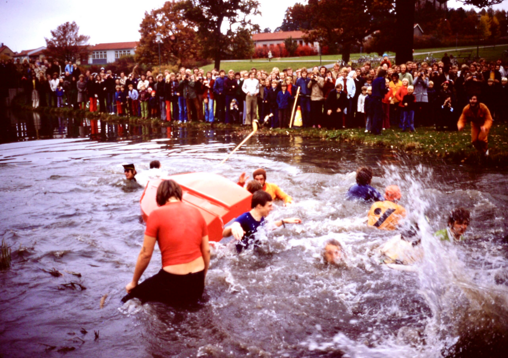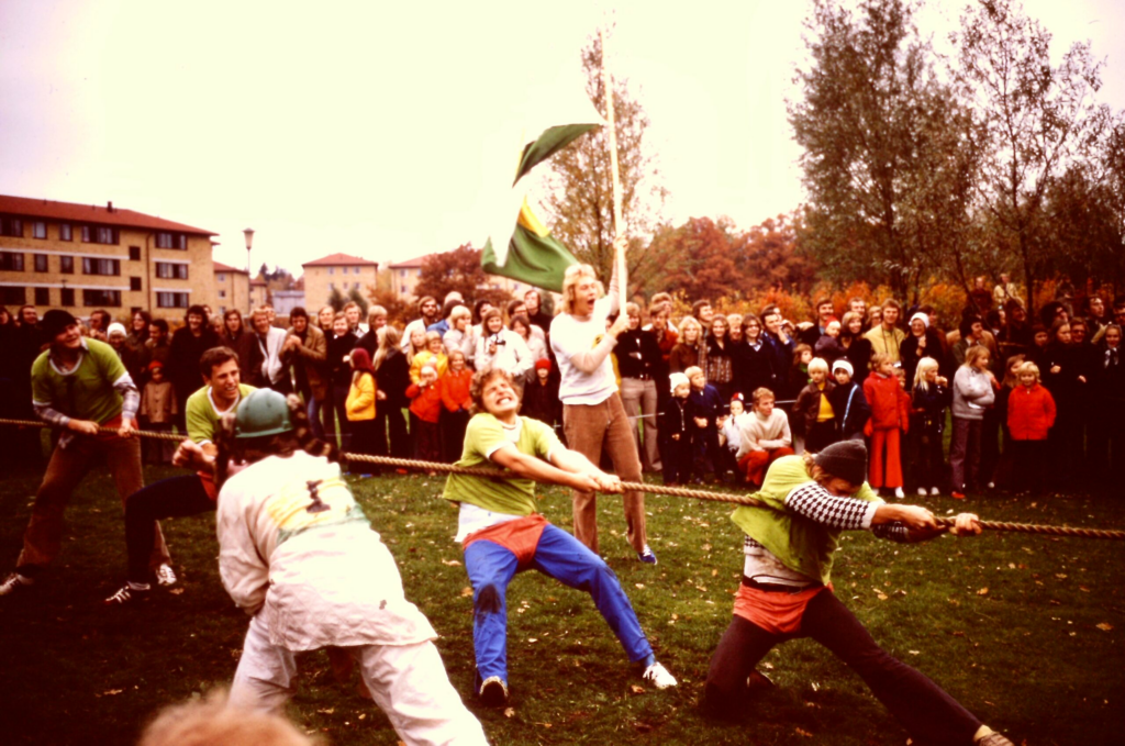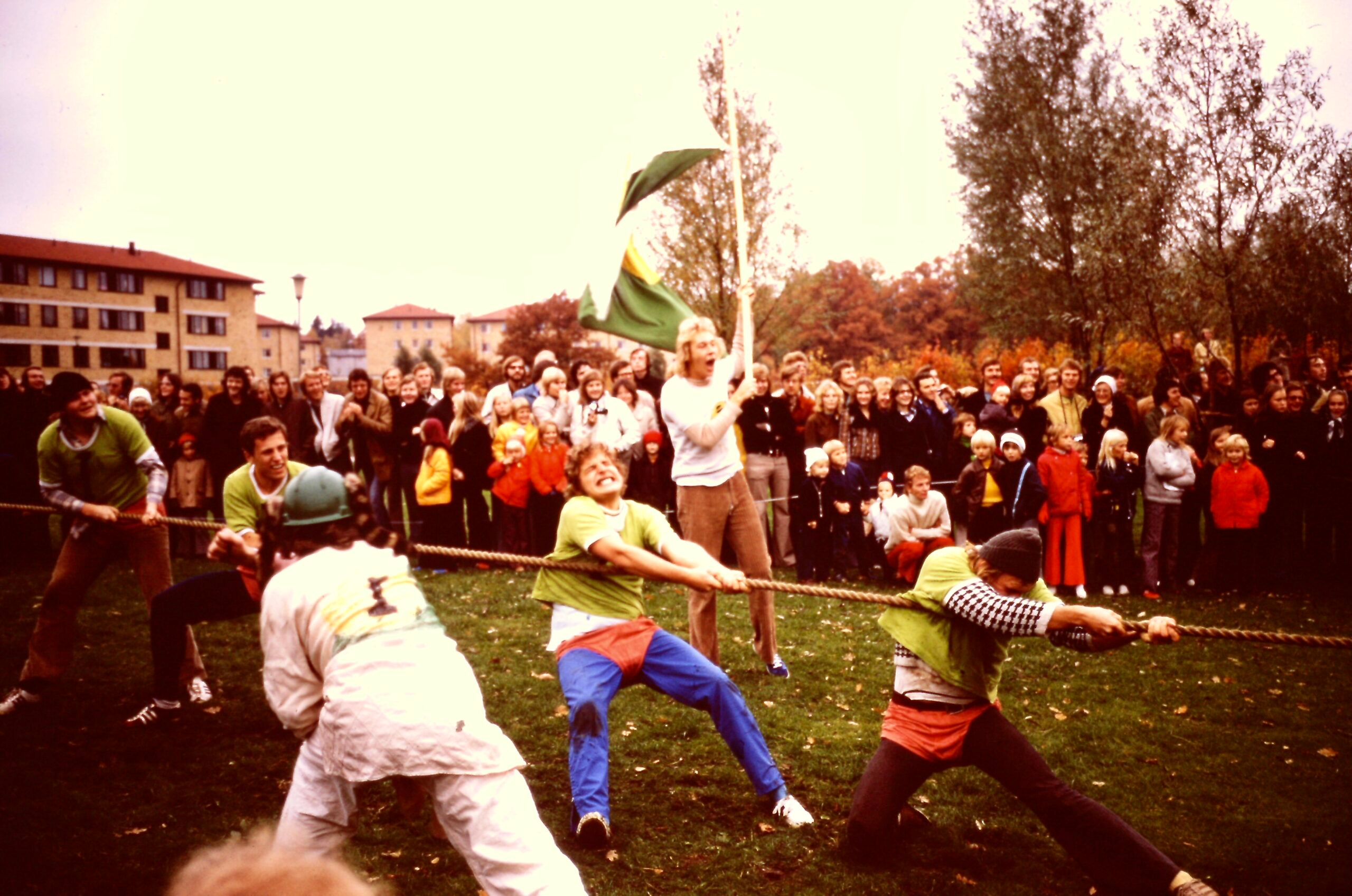 Förutom fester inomhus ordnades tävlingar utomhus. Dragkamp över Tinnerbäcken var ett populärt evenemang. På parkeringen utanför skolan återkom tävlingar med rullskidskor.